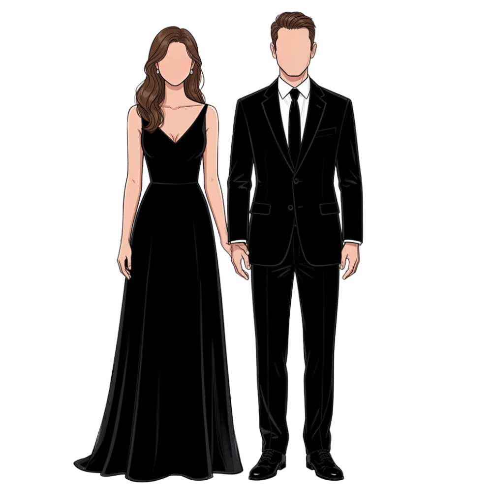 Queremos que utilices tu mejor outfit formal, evitando los blancos y similares. Los otros colores quedan libres para que te luzcas.